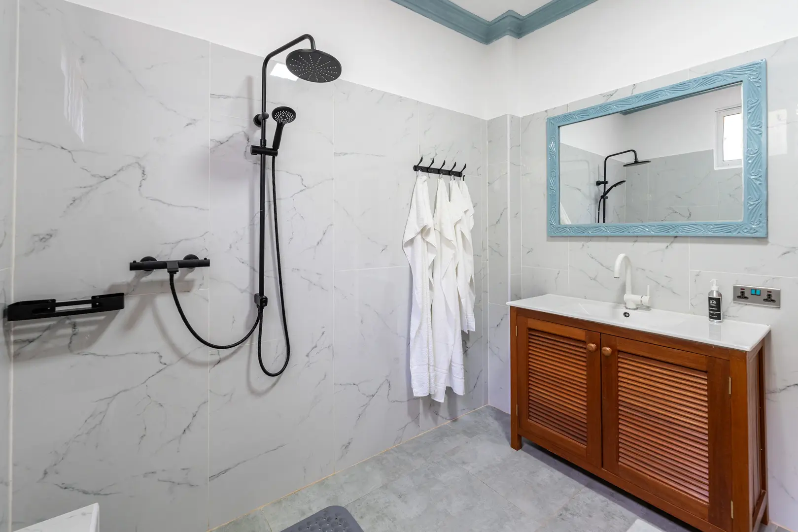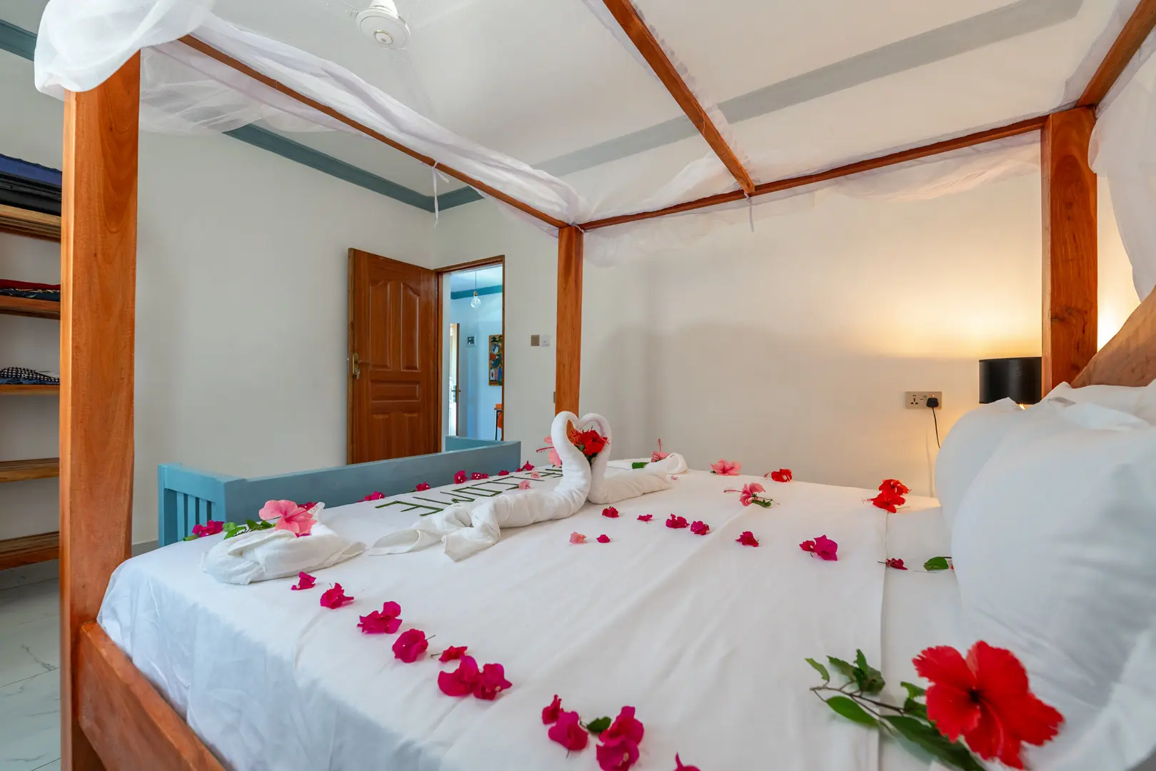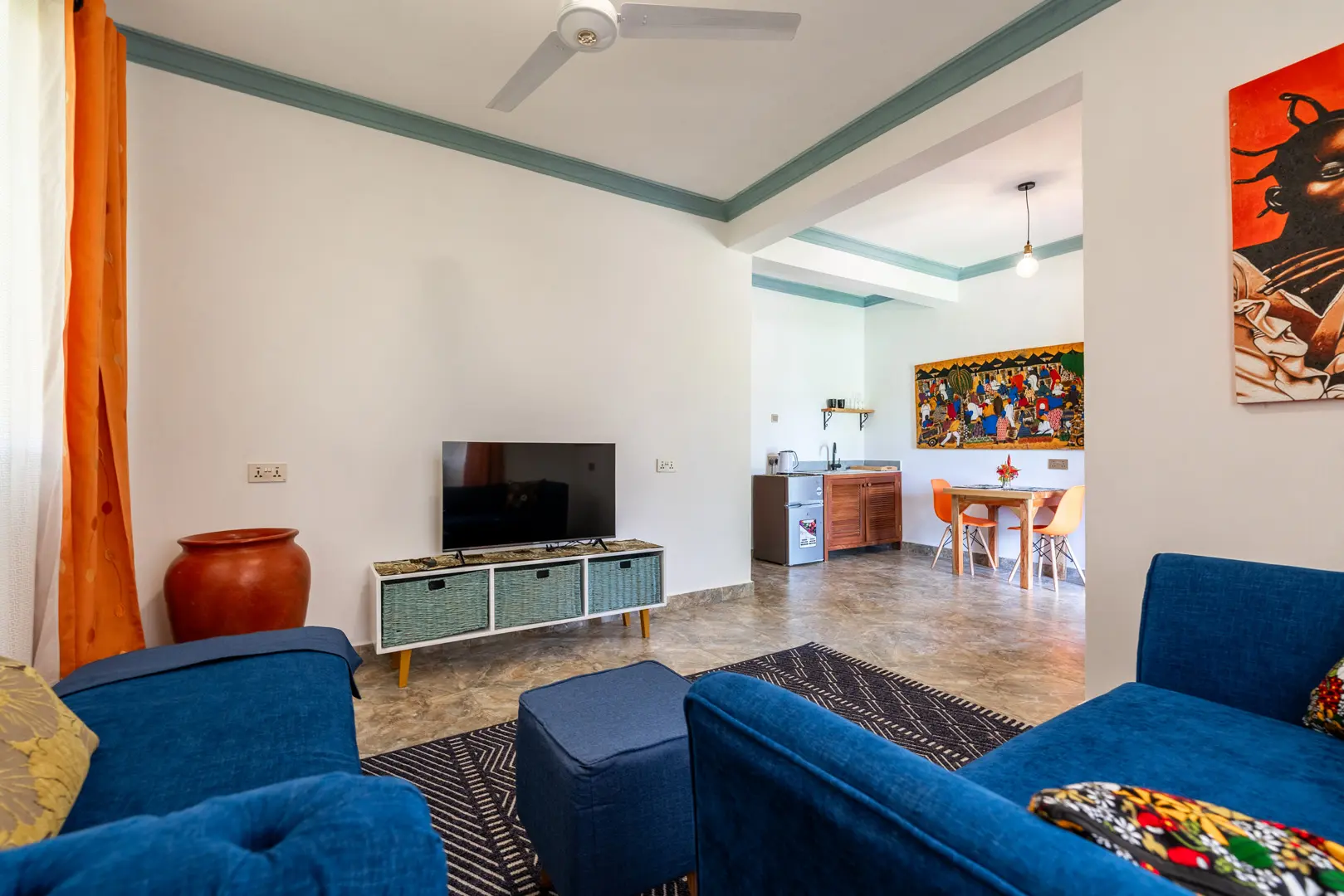 Babylon Gardens is a newly built resort in the heart of Diani Beach, Kenya. Eight spacious one bedroom villas spread out on a 4,000 sqm compound. Each villa has a porch, a sitting room with two sofas, large 43″ smart TV, a tea kitchen (kettle and fridge/freezer) and dining for two. The bedroom has a king size bed with high quality mattress, open wardrobes and air conditioner. The barrier-free bathroom has a walk-in shower. Babylon Gardens is suitable for singles and couples but not for kids under 12.